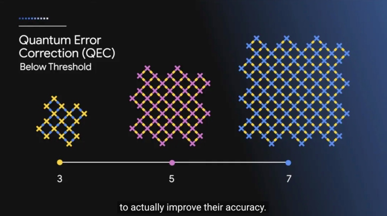 谷歌采用的方法,是通过一种“网格化”的排布,来进行纠错。Willow 采用了 7X7 的网格排布,其中 49 个量子作为数据比特,另外有 48 个量子用于测量。通过这种方式,谷歌“突破了纠错的平衡点”,即增加比特之后,能实现错误减少。