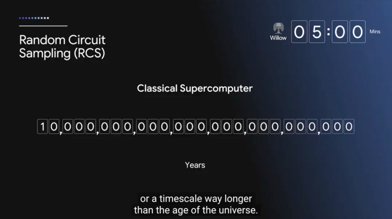 而这一次,Willow 在算力测试中,进一步将理论算力差距拉大到了天文数字的级别。此次 Willow 用 5 分钟完成的计算任务,如果用普通的超级计算机,需要 10^25 年,比宇宙的寿命还长。