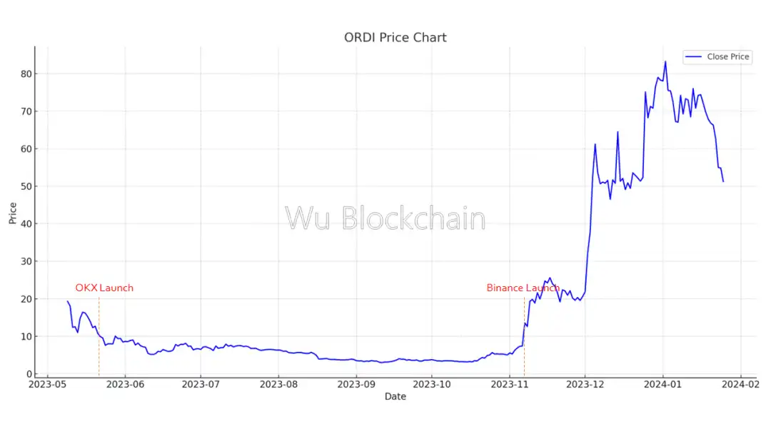 在 2023 年 5 月和 11 月,ORDI 分别上线了 OKX 和 Binance 两大头部交易所,并在上线 Binance 后的一个月时间里完成了十倍涨幅。
