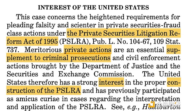 美国司法部和证监会表示,他们对此案“非常感兴趣”,因为该案涉及旨在限制无聊的证券相关诉讼的法律。