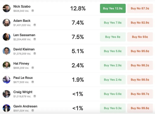 根据上述信息,市场首先挑选出了心目中的中本聪人选,最开始位于押注榜首的是名不见经传的 Len Sassaman,其是一名坚持去中心化信仰的密码学者,于 2011 年自杀。而后 POW 的发明者 Adam Back 来到首位,但随着 Adam 的及时辟谣,最后押注最高的却是 Nick Szabo。