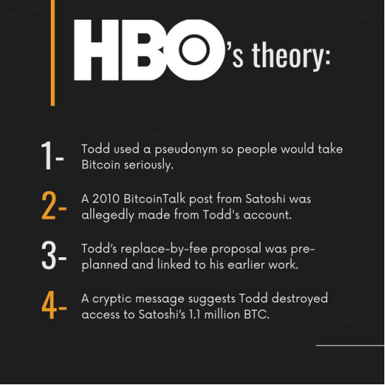 在论证中,一篇 2010 的古早中本聪邮件下,Peter Todd 对其中提到的输入输出进行了回复,而两个账户在几天后都停止了活动,后续 Peter 实现了该帖子中讨论的费用替换功能。因此 HBO 下了一个结论,这就是中本聪真人切错号进行了回复,因此 Peter Todd 就是中本聪。