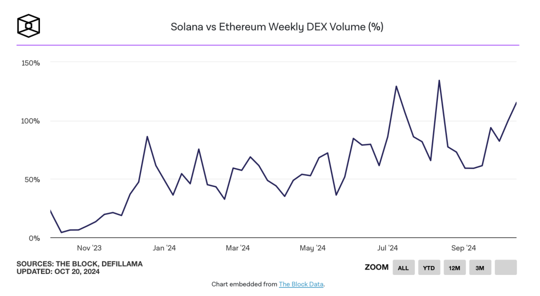HHI 指数的意义在于量化当前现状,这会比 TVL 等数据更为直观,毕竟前五十名币种的交易量较为稳定和真实,当前的市场是比特币首位度畸高,而以太坊松散无力正在聚力中,Solana 凭借 Meme 正在快速上升,某种意义上而言,Solana 已经度过自己的 TheDAO 时刻,在 FTX 崩溃后重新复活已经聚拢起最基本的信仰盘和支持者。