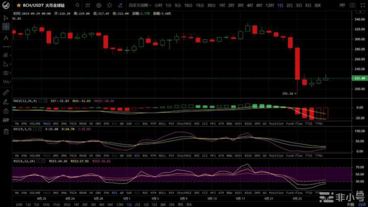 BCH现价:222,上方压力位:250,下方支撑位:200。太子24小时资金净流入排名第一高达13亿,但币价并没有较大涨幅,市场看涨情绪持续降低。指标走势较弱,预计接下来短时内仍将震荡调整。操作建议:留有部分资金搏高的短线投资者可在225附近逢高出货。