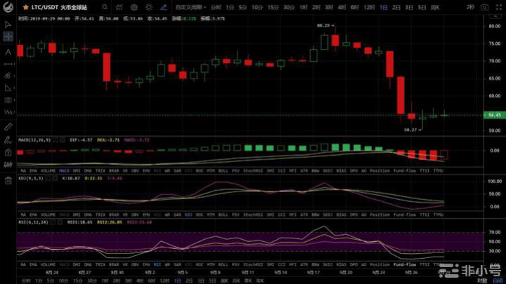LTC现价:54.45,上方压力位:65,下方支撑位:50。莱特连续三天上冲56,但都被上方压力砸下,收出长长的上影线。天图中指标走势较弱,短时指标下行,预计接下来短时内仍将震荡调整。操作建议:暂时观望。