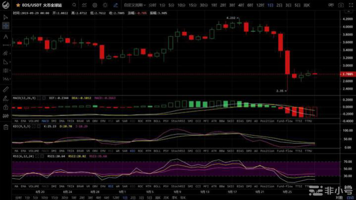 EOS现价:2.78,上方压力位:3;下方支撑位:2.5。柚子今天最高上冲至2.87,然后回落至2.78附近,昨天诸葛建议大家在2.85上方减仓,再次完美预测。小时图中指标下行,预计接下来行情将震荡下行。操作建议:暂时观望。