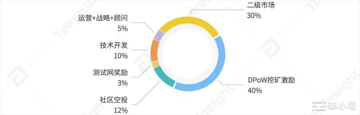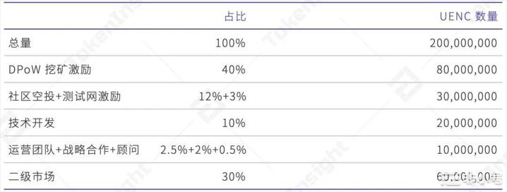 UENC 作为生态的原生通证于2018年3月发行,总量恒定为2亿枚,其中8千万枚(40%)需在 DPoW 共识机制下挖矿铸造;6千万枚(30%)已经 ICO 流通。据项目方披露,UENC 公募价格0.077美元, 2018年8月首发 Fcoin,价格破发至0.027美元,历史最高涨到6.01美元;UENC 目前采用 ERC-20 形式公开发行,早期社区约有7万多地址。2020年11月主网上线,地址数量约30,000个,市场真实流通量大约5千万枚。其通证分布情况如下: