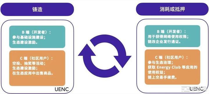 UENC 主要功能包括:消耗或抵押 UENC,获得在 UENC 公链发行通证和开发 DAPP 的权限;获得例如 Energy Club 等生态应用的使用权;在购买商品和服务中享受费用折扣;质押以成为挖矿节点(每个节点需质押500枚 UENC)。持有 UENC 可参与生态治理及获得投票权;参与 UENC 生态收益分配。其通证经济模型如下: