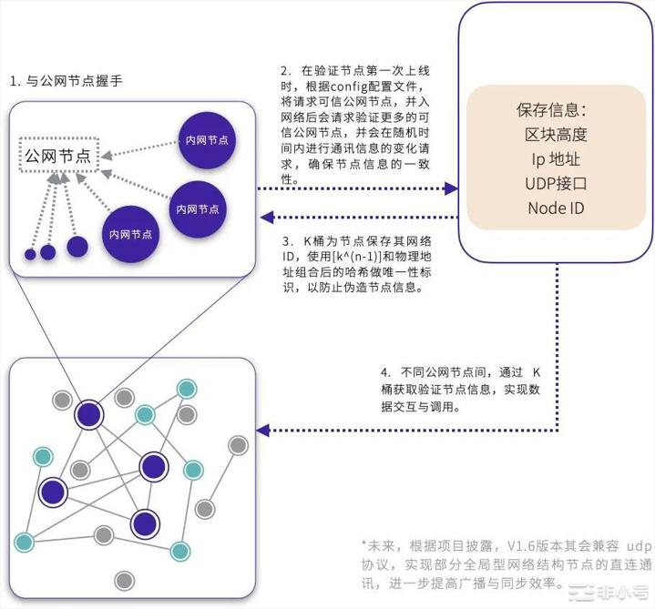 当内网节点进入网络后,根据其白皮书的描述,先要通过一定时间的适应期(依据网络规模而定),在此期间,内网节点与公网节点请求握手,并且公网节点之间由于有明确的ip地址,可以明确各自所在的位置,具体验证节点的信息如区块高度、ip地址等将会被保留在 K 桶里面(Kad 的路由表)。