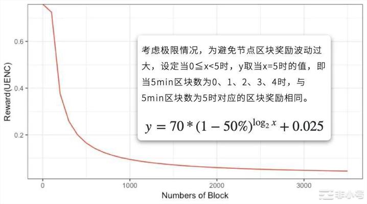 UENC 在区块奖励算法设置时参考了联合曲线的设计逻辑,采用 log 混合函数建立区块数与奖励数的函数关系,以实现早期高奖励、未来趋向于恒定奖励且具有连续平滑变动效果的区块奖励机制。