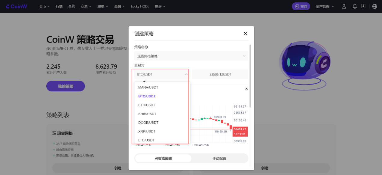 网格交易目前支持AI智能策略与手动配置策略两种模式,可根据实际需求选择。