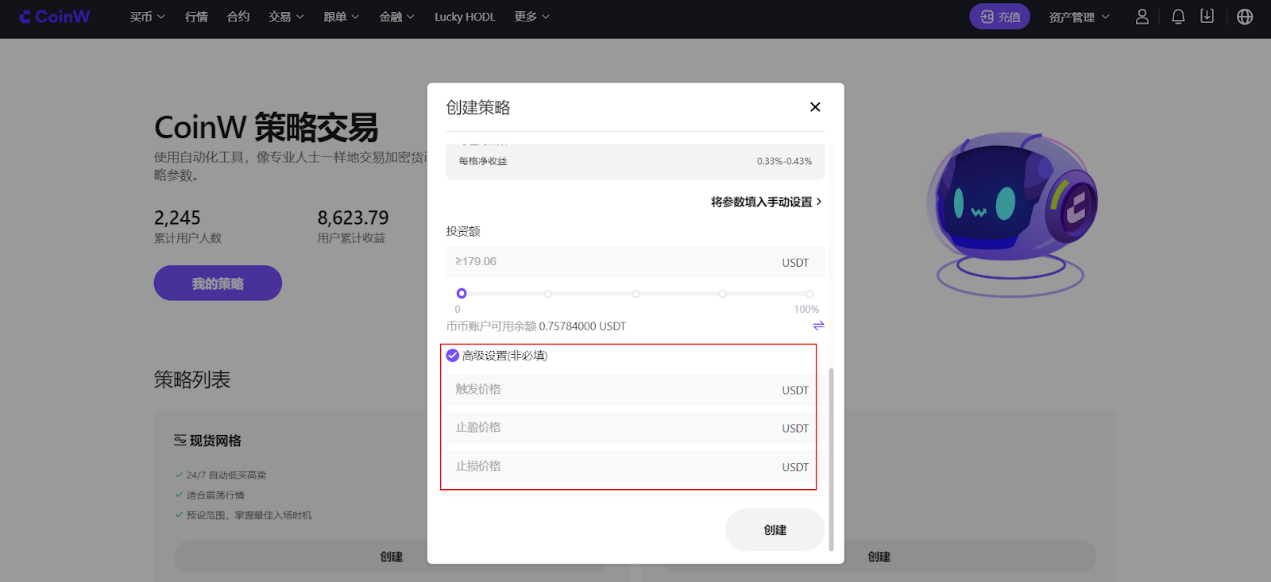 创建网格策略时,可选择高级设置,设置策略运行的止盈止损价格。