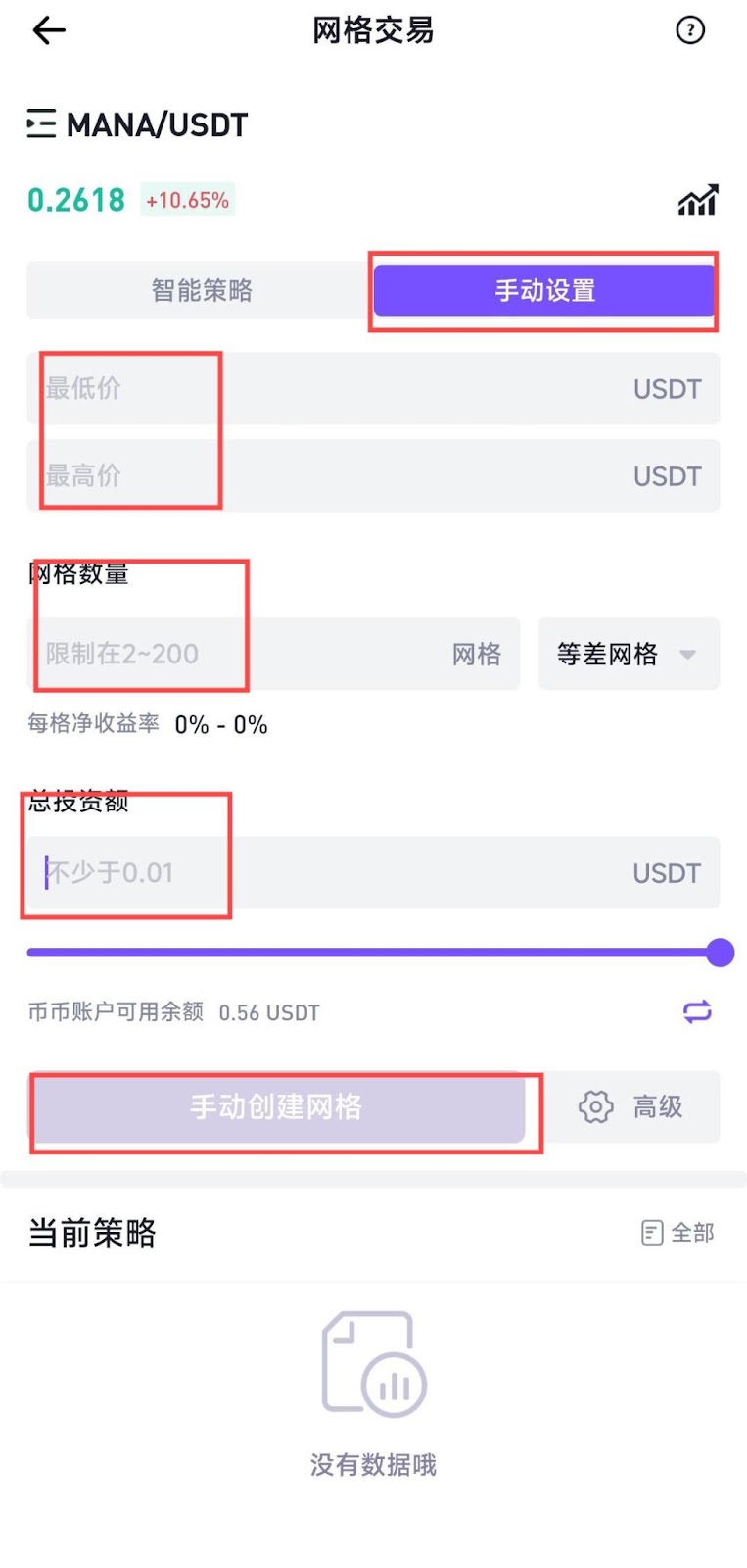 在网格交易页面,选择手动设置,分别输入区间价格、网格数、选择网格类型(等差网格/等比网格)、总投资额后即可创建网格。