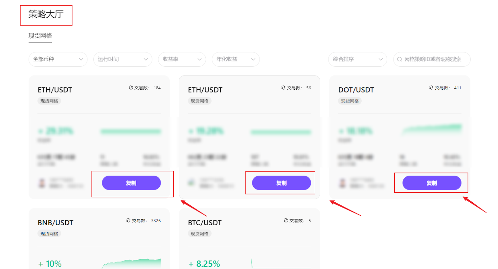 在策略中心,不仅可以创建网格交易策略,还可跟随优秀策略参数进行跟单交易,在策略大厅中选择已运行网格产品进行跟单操作,筛选意向跟单网格策略后,点击【复制】即可轻松跟随策略。