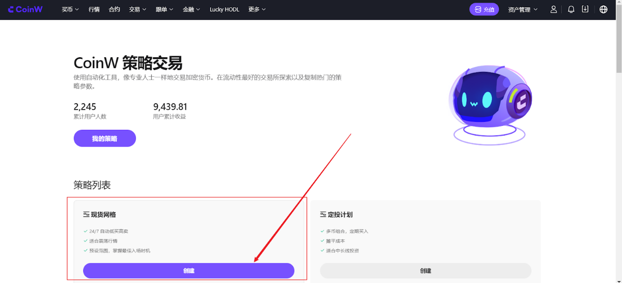 通过首页顶部导航栏“交易”模块中“策略交易”按钮进入策略中心页面,在策略列表中选择“现货网格”产品,点击【创建】。