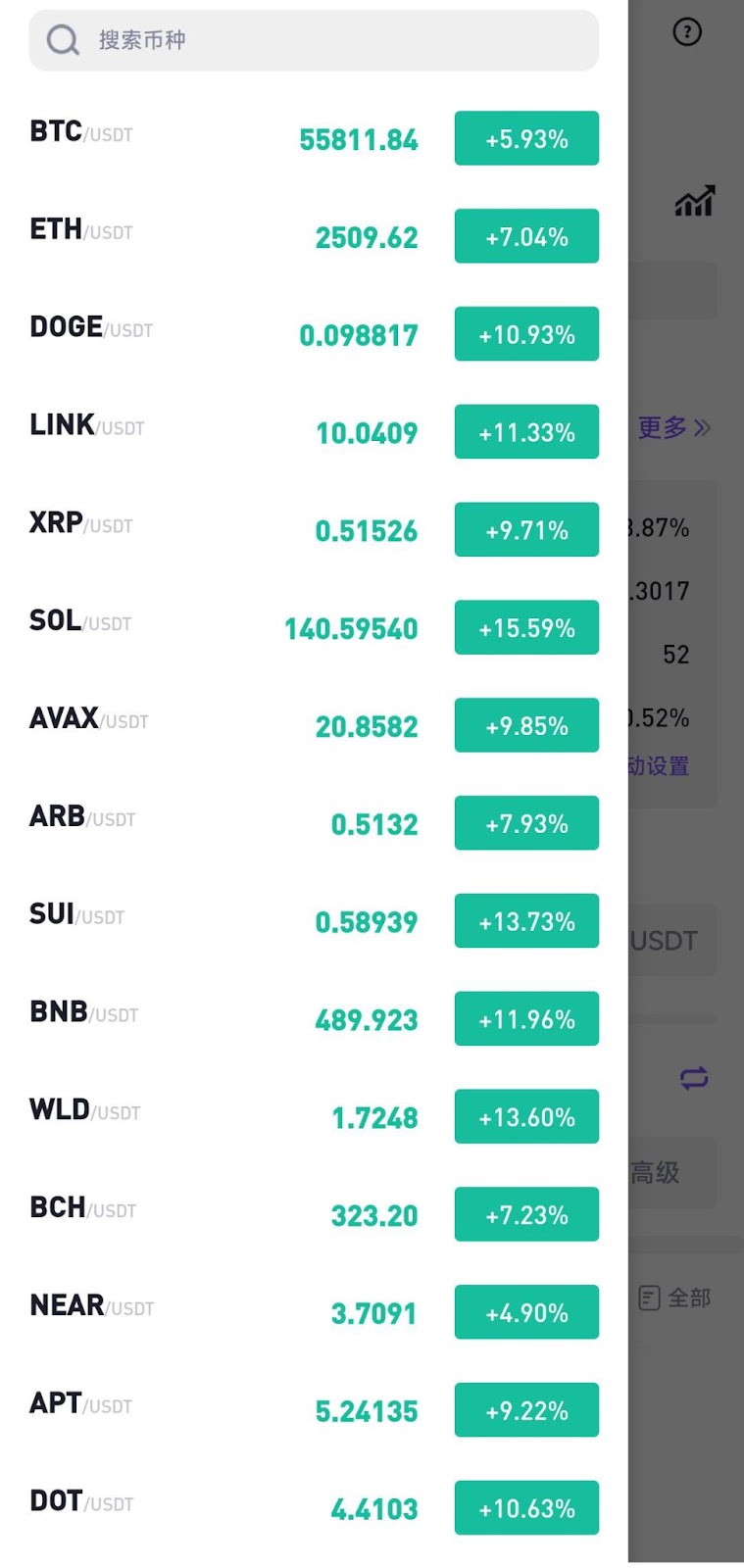 进入网格交易页面后,点击左上方币种名称“三”区域,即可进入网格交易币种列表,选择网格交易币种。