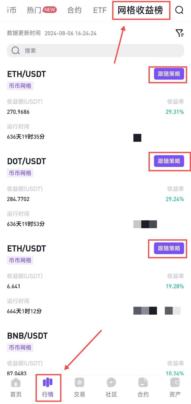 网格交易,不仅可以自主创建网格策略,还可跟随优秀策略参数进行跟单交易,在行情页“网格收益榜”中选择已运行网格产品进行跟单操作,筛选意向跟单网格策略后,点击【跟随策略】即可轻松跟随策略。