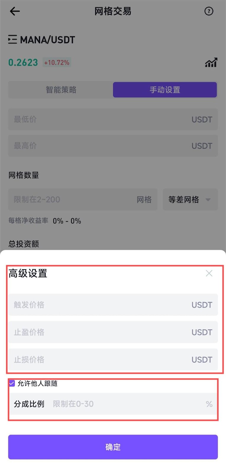 在手动配置网格策略中,除了可选“高级设置”对网格策略进行止盈止损外,还可设置“允许他人跟随”并设置盈利分成比例。