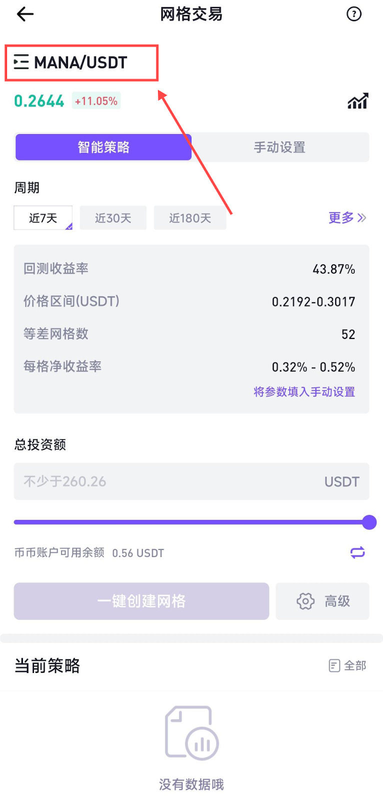 在网格交易页面,选择智能策略,选择网格周期类型后,输入总投资额,即可轻松创建网格策略。