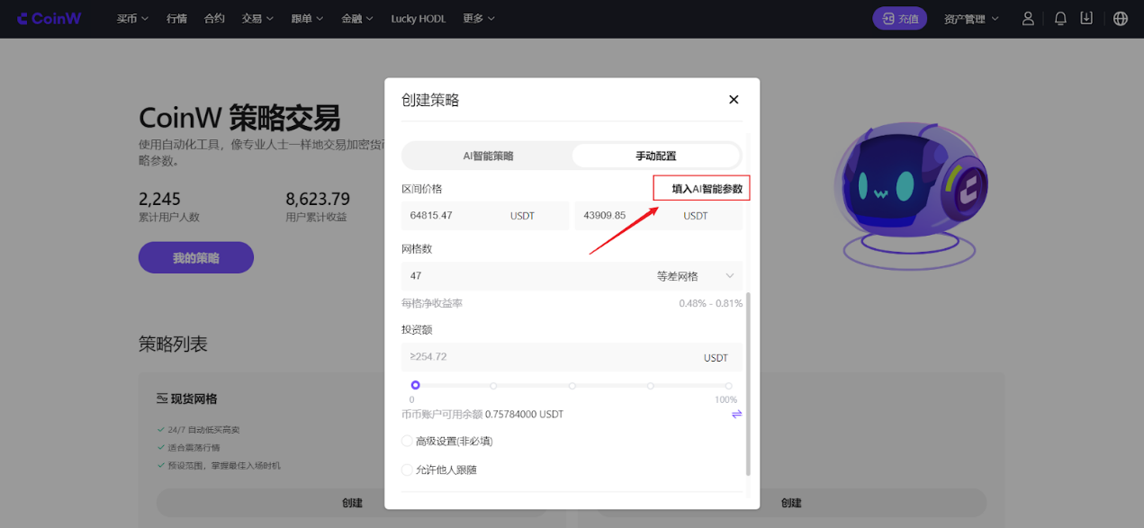 在手动配置网格策略中,若想使用AI参数手动配置,也可点击“填入AI智能参数”,自动获取AI智能策略参数