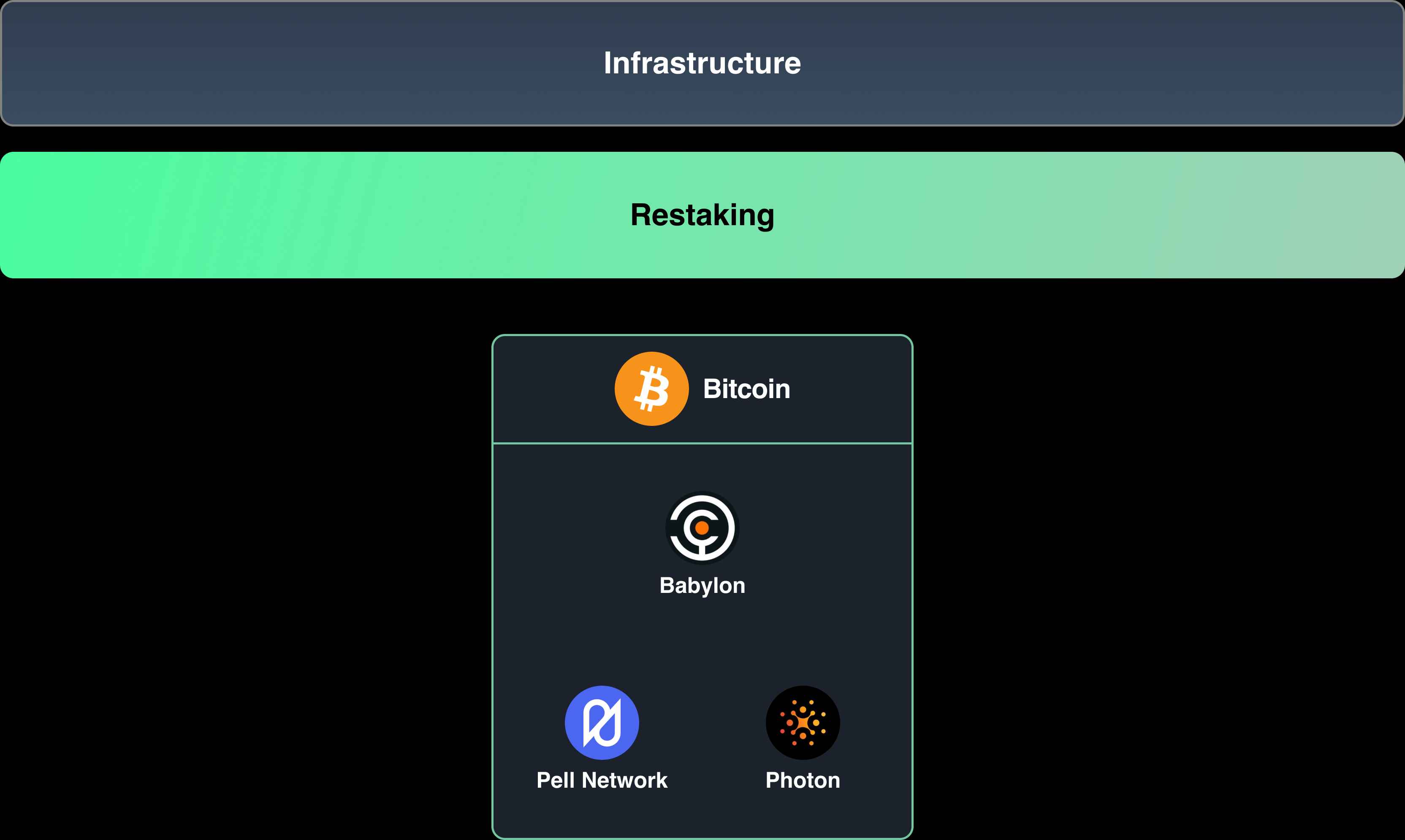 比特币作为一个基于 PoW 的网络,其特性与质押资产直接与安全性相关的 PoS 网络不同。然而,比特币在市值上的主导地位推动了再质押概念的发展,这些概念利用比特币的经济安全性在其他区块链中创造额外收入。像 Babylon、Pell Network 和 Photon 这样的项目通过多种方法将比特币的安全性整合到他们的生态系统中,从而增强其可扩展性。