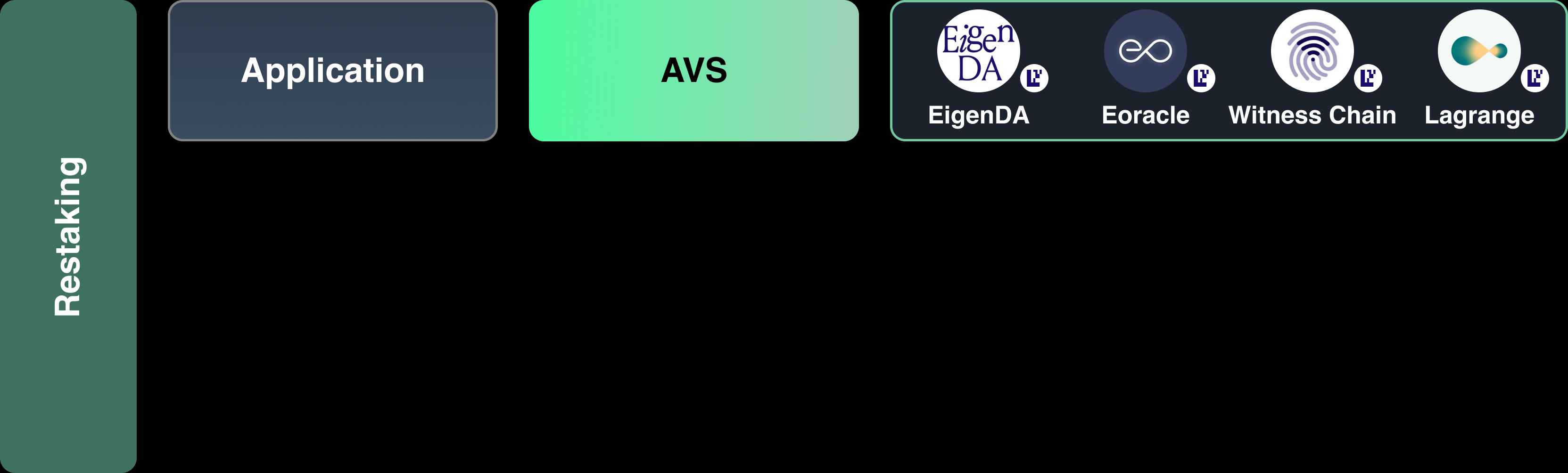 再质押应用层包括那些利用再质押资产来增强现有区块链基础设施安全性和功能的去中心化服务和应用。这些应用通过再质押来确保经济安全,同时专注于提供特定功能,例如数据可用性存储、预言机、物理基础设施验证和跨链互操作性。