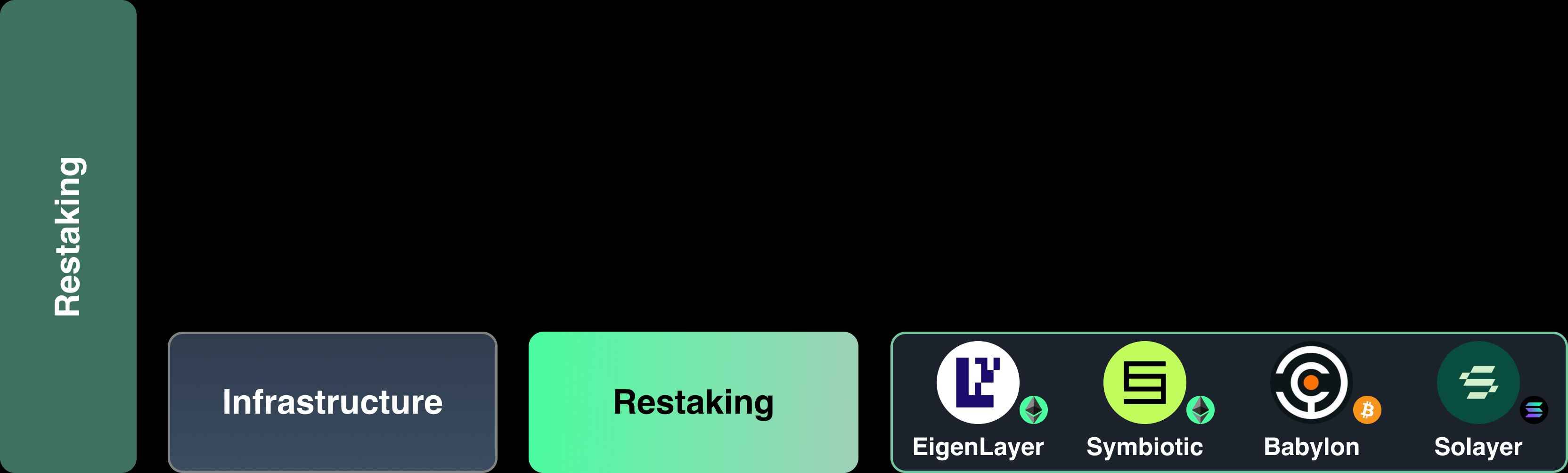 再质押基础设施提供了实现再质押的技术基础,使已质押的资产能用于保护其他协议或网络。在这一领域的知名项目包括以太坊的 EigenLayer、比特币的 Babylon 和 Solana 的 Solayer。这些项目专注于确保流动性、增强安全性以及提升网络的可扩展性。