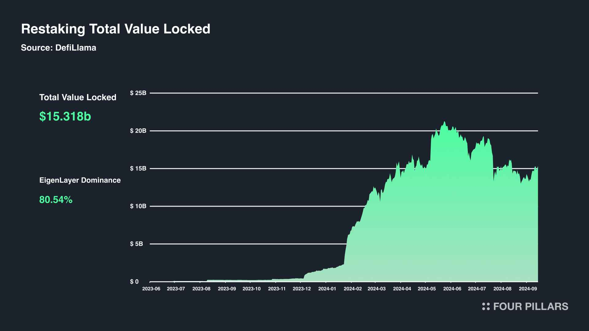 截至 2024 年 9 月 28 日,由 EigenLayer 引领的再质押生态系统的总锁定价值 (TVL) 约为 153 亿美元。这一数字超过了加密借贷平台 Aave 的 130 亿美元 TVL,并且超过了领先的以太坊流动质押平台 Lido 的 TVL (264.8 亿美元) 的一半。这突显了再质押生态系统的显著增长。