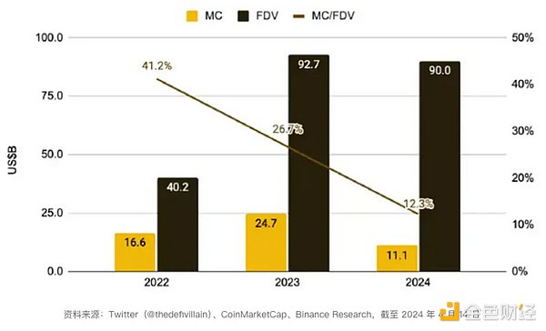 本来市场上能够承接的山寨币资金体量有限(几十亿到几百亿美金),这些估值过高的新项目上市交易,挤占了市场上的流动性资金,很难获得持续性的买盘力量,导致新币上线交易所后出现了阴跌走势,散户进场接盘的意愿大为降低。而且随着后续代币的不断解锁和释放量的增加,市场持续面临巨大的抛售压力。