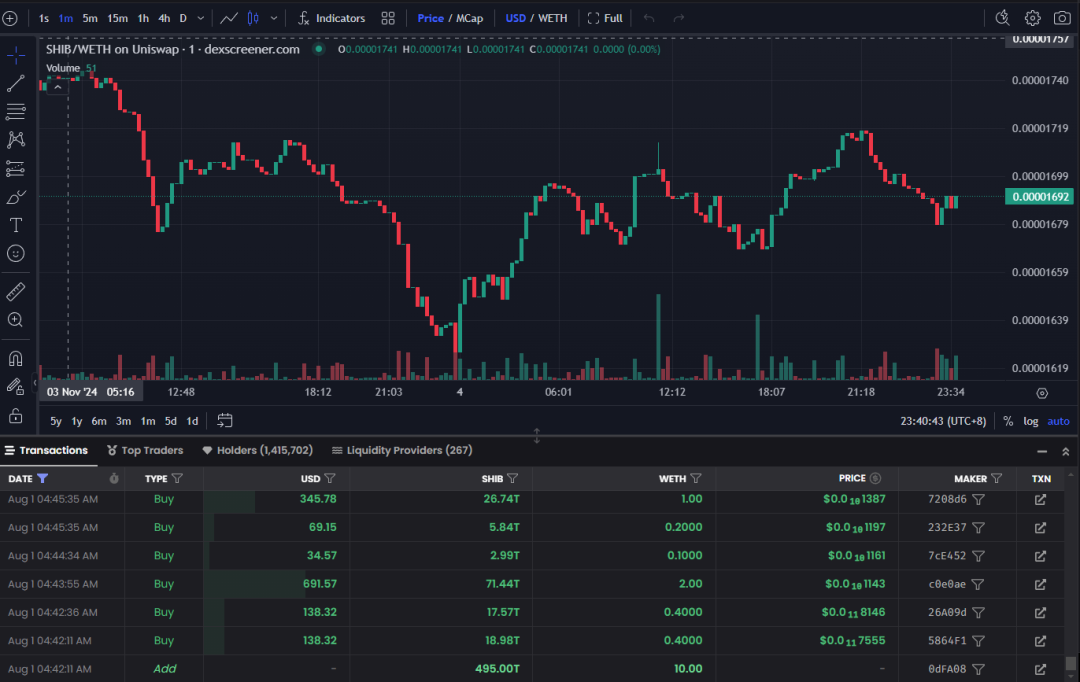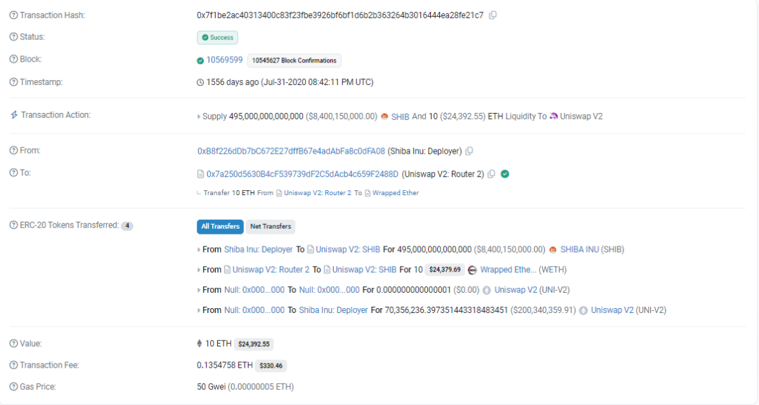 深入观察 Meme 的一级市场诞生过程对于理解 Meme 的有一定的帮助,特别是那些基于公链的 Meme,即使过去了几年,依然能够查看到最初的流动性建立。以 SHIB 为例,我们能够通过查看 SHIB 添加流动性池的初始交易,得以知道其市值的惊人增长。最初,SHIB 的市值仅相当于 20 个 ETH,当时的价值大约为 10K 美元,折算如今的 ETH 市价,SHIB 的初始市值也仅仅是 50K 美元。这对于一年之内市值增长至十亿级别的 Meme 来说,其财富增长效应无疑是极具吸引力和宣传价值的。