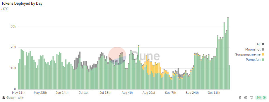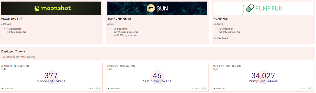 在发射机制方面,Moonshot 相较于 pump.fun 的主要改进在于支持不同外部 DEX 的初始池子添加,以及在初始打满市值时有所差异。除此之外,两者在其他方面的区别并不显著。至于 Sunpump,其整体机制与 pump.fun 相似。由于行业普遍遵循“first is first”原则,即便通过代币空投等激励手段吸引用户进行吸血鬼攻击,新进入者也很难实现大幅度超越。接下来,我们结合 dune 的数据来深入了解 pump.fun、Moonshot 和 Sunpump 的数据表现,以评估它们在市场中的表现和竞争力。