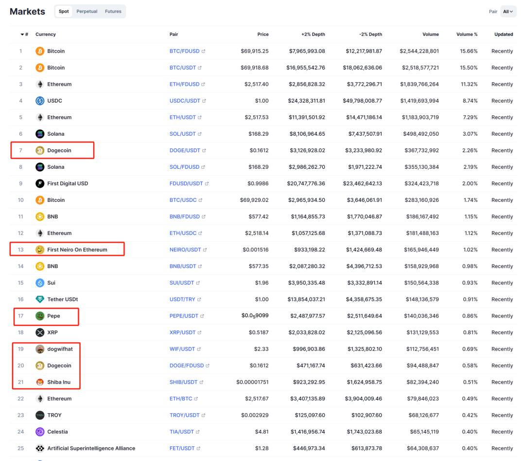 庞大的交易量和新用户:Meme 能够带来庞大的交易量并且有一群相对忠实的用户群体。由此,对于 CEX 而言,上市 Meme 币种可以成为吸引流量和用户的重要策略。以币安现货市场为例,交易量排名前 30 的交易对中,有 20% 都是 Meme。