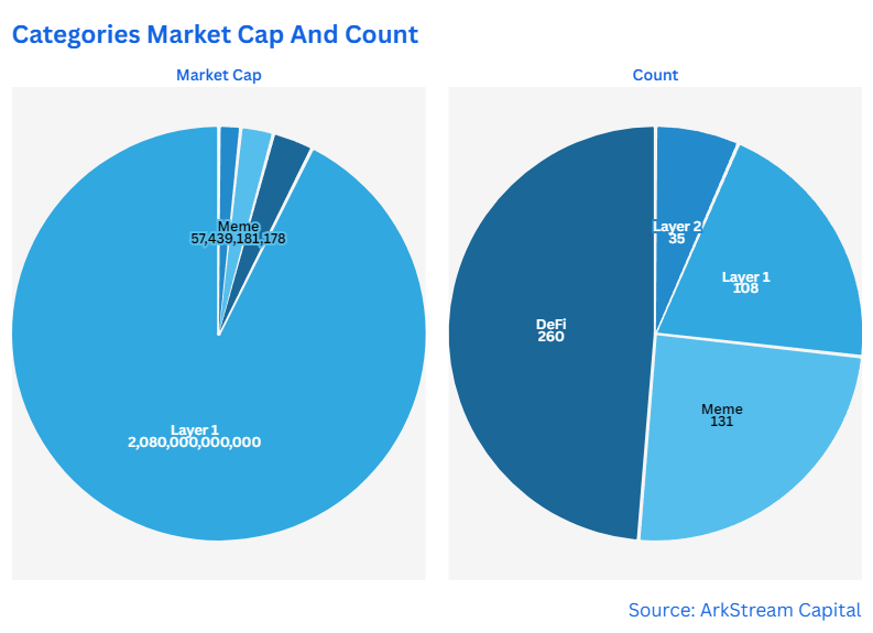 市值和数量变化:Meme 的市值和流通数量的变化可以反映市场对其的需求和接受程度。尽管部分 Meme 代币虽然市值不高,但新增 Meme 数量表明了社区对整个板块的兴趣在增长。相比于其他板块(Layer1/Layer2/DeFi),Meme 在近两年的板块总市值、新增数量等方面都是远远领先。