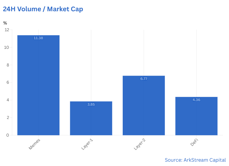 2、Meme 的日均换手率大约为 11%,相比之下,DeFi 为 5%,Layer2 为 7%,Layer1 的日均换手率是 4%,这一比例不仅凸显了 Meme 的高流动性,也表明用户对 Meme 的兴趣和交易频率较高。
