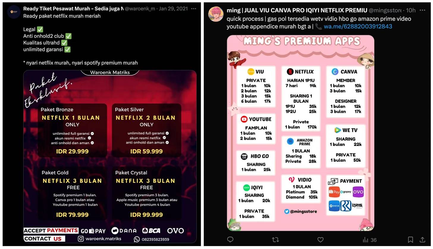 在 X 平台上转售 Netflix、Spotify、YouTube 等的免费试用账户,来源:每个 X 账户