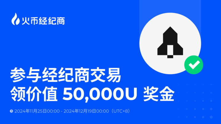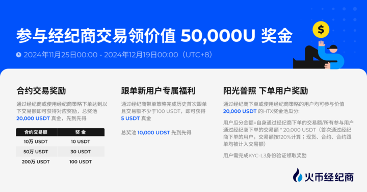 本次活动的时间为2024年11月25日00:00至12月19日00:00(UTC 8),面向通过火币经纪商交易的用户开放。 活动总奖池高达50,000 USDT,用户可通过参与3个活动来瓜分奖励。