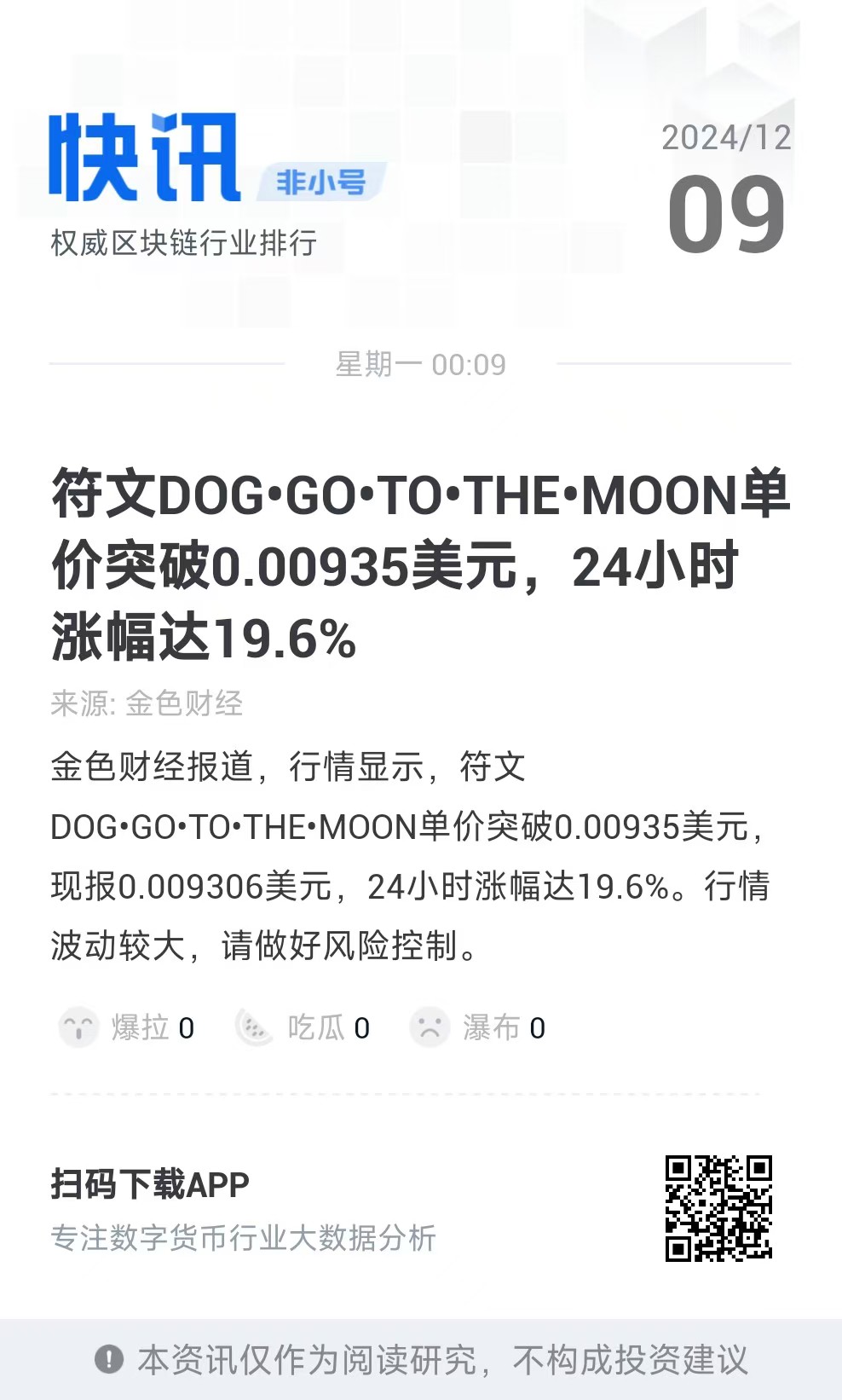 根据最新的市场数据,符文狗的价格突破了0.00935美元,24小时涨幅达到了19.6%。这一显著的涨幅不仅展示了符文狗的市场活力,也反映了投资者对其的强烈信心。我们的市场预测已经得到了初步验证,投资者应持续关注符文狗的动态,以把握市场机遇。