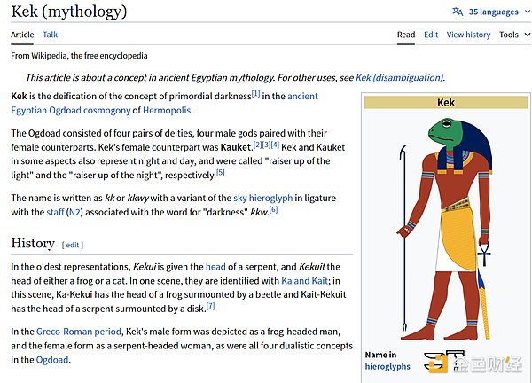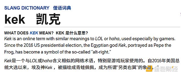 随着互联网文化的发展,这个词在 4chan 和 Reddit 等平台上衍生出新的用义。网友们发现在古埃及神话中存在一位名为「Kek」的神明,在希腊 - 罗马时期被描绘为蛙头人身的形象,且被视为混沌与黑暗的象征。这个巧合让这个互联网用语获得了更深层的文化意涵。