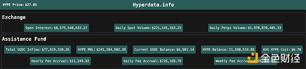 目前 AF 的策略仍然是定期将积累的全部 USDC 购买为 HYPE,因而我们可以简化的根据 AF USDC 流入数据来跟踪 Hyperliquid 的利润情况,以及对 HYPE 的回购力度。根据 hyperdata.info 的数据,目前 AF 累计 USDC 流入超过 7700 万美元,最近一个月超过 2500 万美元,日均回购约 100 万美元的 HYPE。