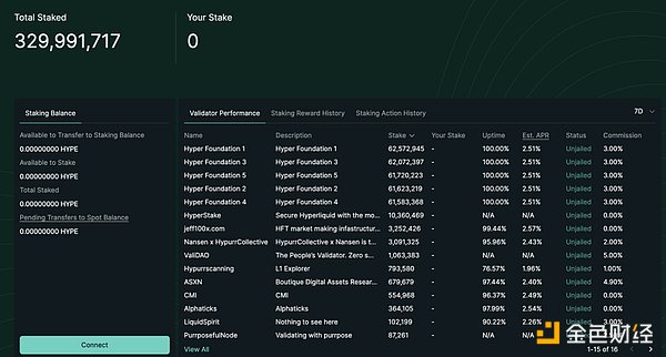 2024 年 12 月 30 日,Hyperliquid 正式上线了 HYPE 质押功能,目前的 HYPE 质押的收益率大概在 2.5% 左右,这部分收益仅包括固定的 PoS 共识层收益,其收益率共识参考了以太坊共识层的收益率共识(收益率与质押 HYPE 数量的平方成反比),目前除了团队和基金会的 3 亿枚代币之外,也有接近 3000 万的用户代币参与了质押。