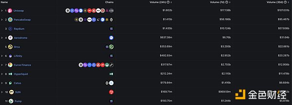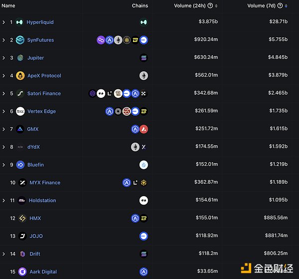 去中心化衍生品交易所 7 日交易量排序 来源:DeFiLlama