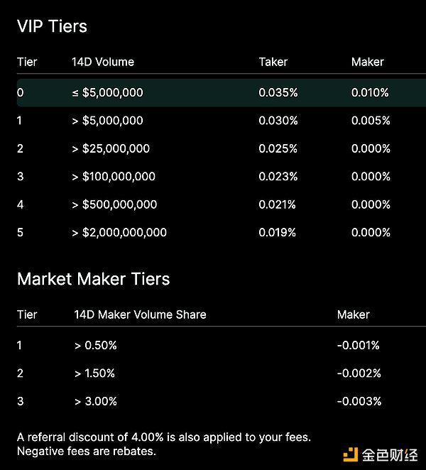 对于终端用户而言,Hyperliquid 的体验与 Binance 等中心化交易所几乎完全一致,不只在交易体验和产品结构层面,在交易费率和折扣规则等方面也同样如此。和中心化交易所唯一的区别, 在于 Hyperliquid 无需 KYC。