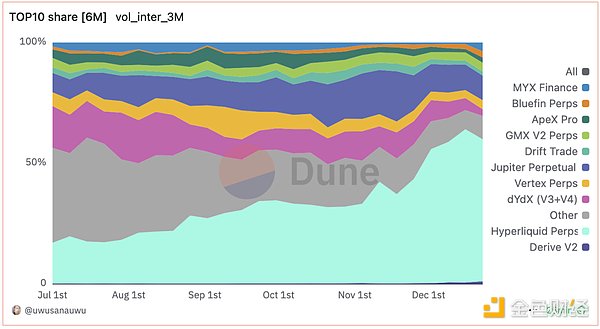 Hyperliquid 近期数据有明显下降(最高单日交易量 104 亿美金,最近几日交易量不足 50 亿美金),不过其持仓量仍有 Binance 的 10%,交易量则有 Binance 的 6%;持仓和交易量也大概相当于 Bitget 和 Bybit15% 的水平。在其热度最高时(12 月 17-20 日),Hyperliquid 的持仓量可以达到 Binance 的 12%,交易量达到 Binance 的 9%;持仓量和交易量数据都接近 Bybit 和 Bitget 的 20%。