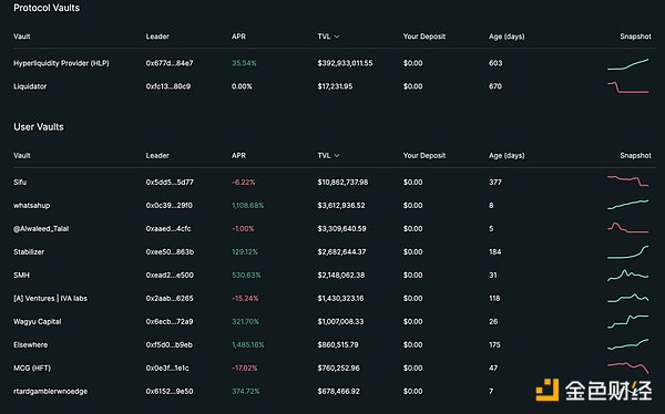 在交易产品之外,Hyperliquid 从产品建立初始就提供了 Vault 的功能,Vault 类似中心化交易所里的「跟单」,所有人都可以将资金投入到任意 Vault 中,由 Vault 主理人进行投资,获得收益中会有 10% 分配给 Vault 主理人,同时为了保持利益一致性,主理人需要保证至少持有 Vault 5% 的份额。