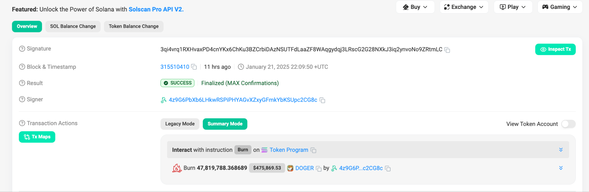 为更好的投入项目建设与AI应用,$Doger 开发团队决心销毁团队持有的全部代币共计4.78%流通占比,价值70万美金的代币。