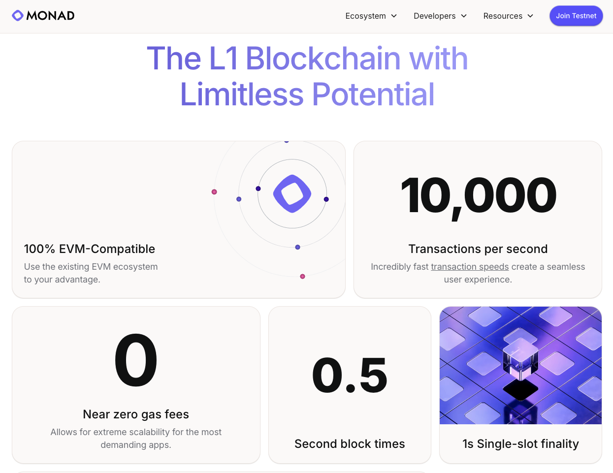 - - 高性能 L1 区块链,挑战以太坊 – Monad 目标是解决以太坊的扩展性问题,提供 10,000 TPS、1 秒区块确认 和 超低手续费,成为更快、更便宜的选择。
