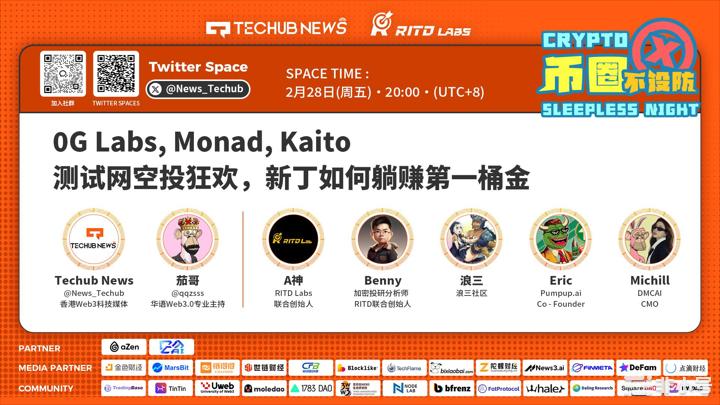 由香港Web3媒体Techub News主办的Space栏目《币圈不设防》首期节目以"0G Labs、Monad、测试网空投狂欢与新丁掘金攻略"为主题,邀请了Web3华语主持人茄哥、A神、Benny老师、浪三、Eric、Michill等资深从业者,围绕加密市场的残酷现实与生存智慧展开激烈碰撞。本期节目摒弃传统说教模式,通过实战派嘉宾的血泪经验,为观众呈现了一场兼具深度与警示意义的行业解剖。