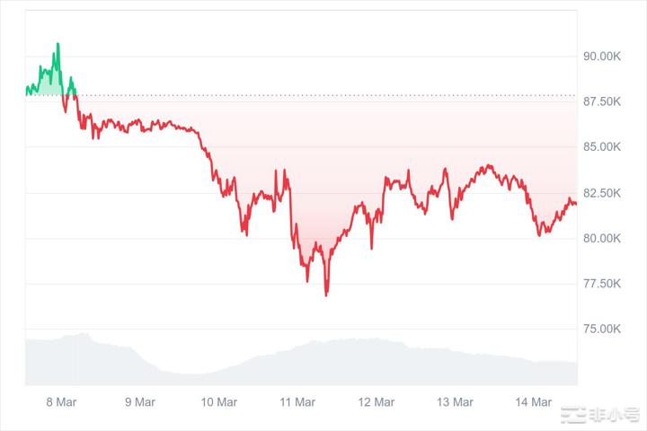 3月11日,比特币价格在24小时内再次跌破8万美元,最低触及7.6万美元,市场恐慌情绪蔓延。截至2025年3月13日,比特币价格下跌3%至81,148美元,市场情绪低迷,中心化交易所交易量下降21%。