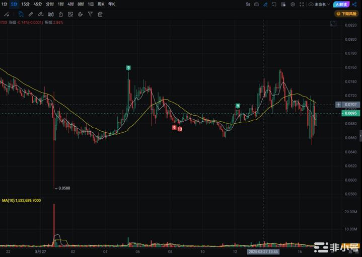 早盘那根针插到0.055刀,爆了42万刀多单,反弹量能却萎缩60%,明摆着狗庄自导自演