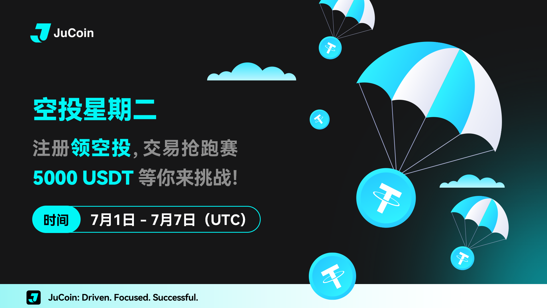 尊敬的用户:JuCoin 将举办“空投星期二”活动,交易量达标的用户,即可瓜分 5,000 USDT 空投!先达标的前100名还可额外获得5USDT的奖励。